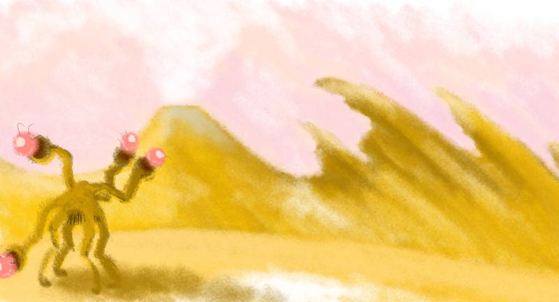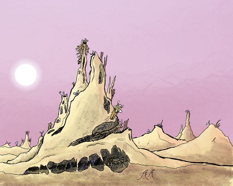 This is the middle season on scaverkus. The home sun looms, but this is still the optimal habitable condition for life on scaverkus as the [[Stevik]] themselves peer out of crevices in their venting mound to collect and gather what they can on the surface to fuel elaborate underground cave life. For on Scaverkus, ecologies seasonally cooperate in elaborate support networks to handle what are the extremely brutal seasonal cycles of their desert world. The crevices here are very exposed during the middle seasons only, otherwise they are mostly sealed. What shapes the terrain is indeterminable for the most part, as the Stevik phyla has utterly reshaped the terrain on Scaverkus for millennia as much as the the volcano and frost seasons have. This has produced a clay-like terrain in large shares of the world, with spires and galleys carved out from the glaciers.