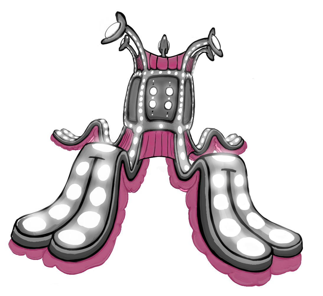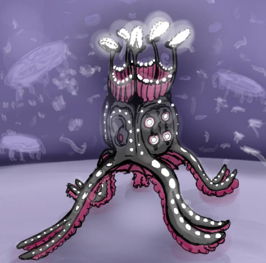 Swimming wise, the Ikirmites are able to move shockingly fast, butalso "run" on the sea floor with their tentacle-roots as needed. Their muscular system is mostly soft bodied, but their dark exterior is incredibly bony in texture, with a rough and thick mantle that encases the soft rubbery flesh within. Their light limbs have bulbous masses of bioluminescent cells and are very ligament-like, the result of a prior earlier sessile polyp phase of their lives that is more rooted and reliant on chemotrophy.